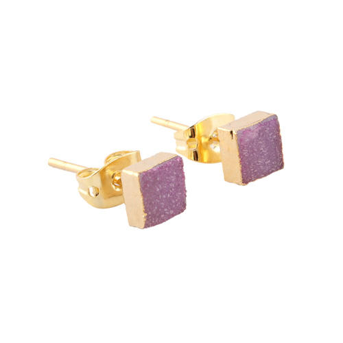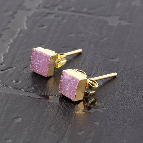 Shining Crystal Pink Sugar Druzy Simple Small Square Shape Stud Earrings Brass Yellow Gold/Silver Electroplated for Weddings