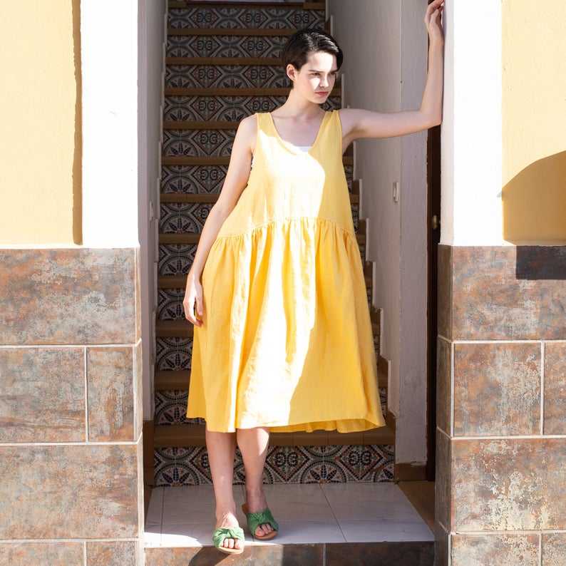 Shining Yellow fashionable trending latest design yellow color crepe fabric o-neck sleeveless knee-length women linen dress