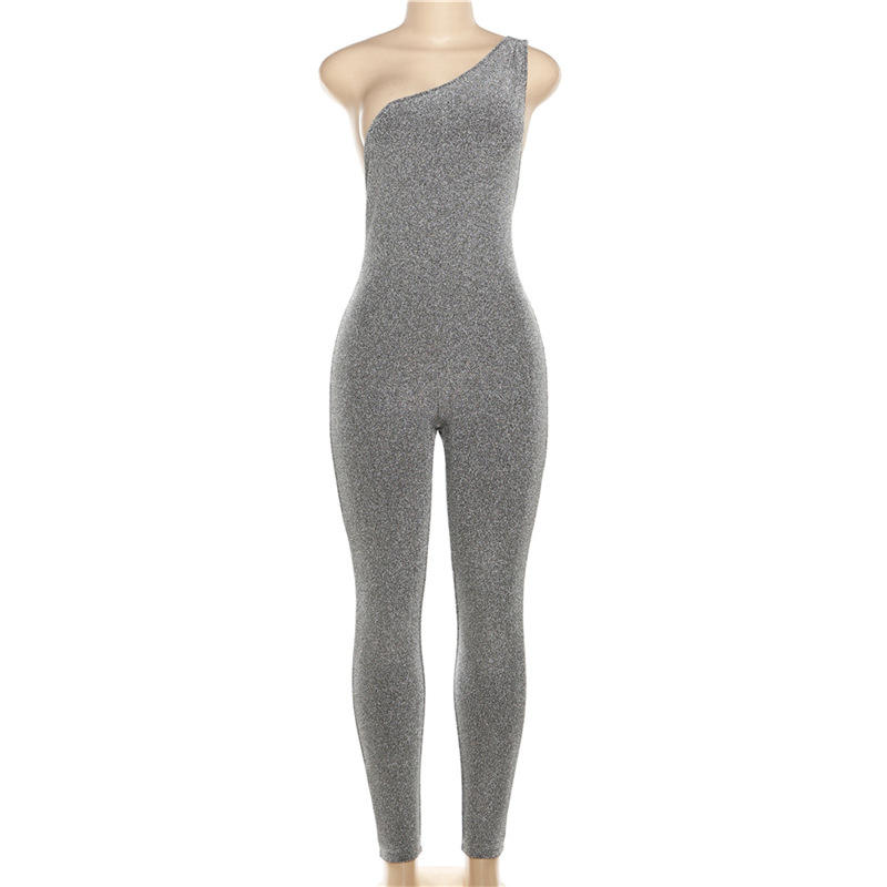 Shiny Asymmetrical Jumpsuit Women Solid Stunning Incline Shoulder Backless Shirring Body-shaping Overall Female Attirewear