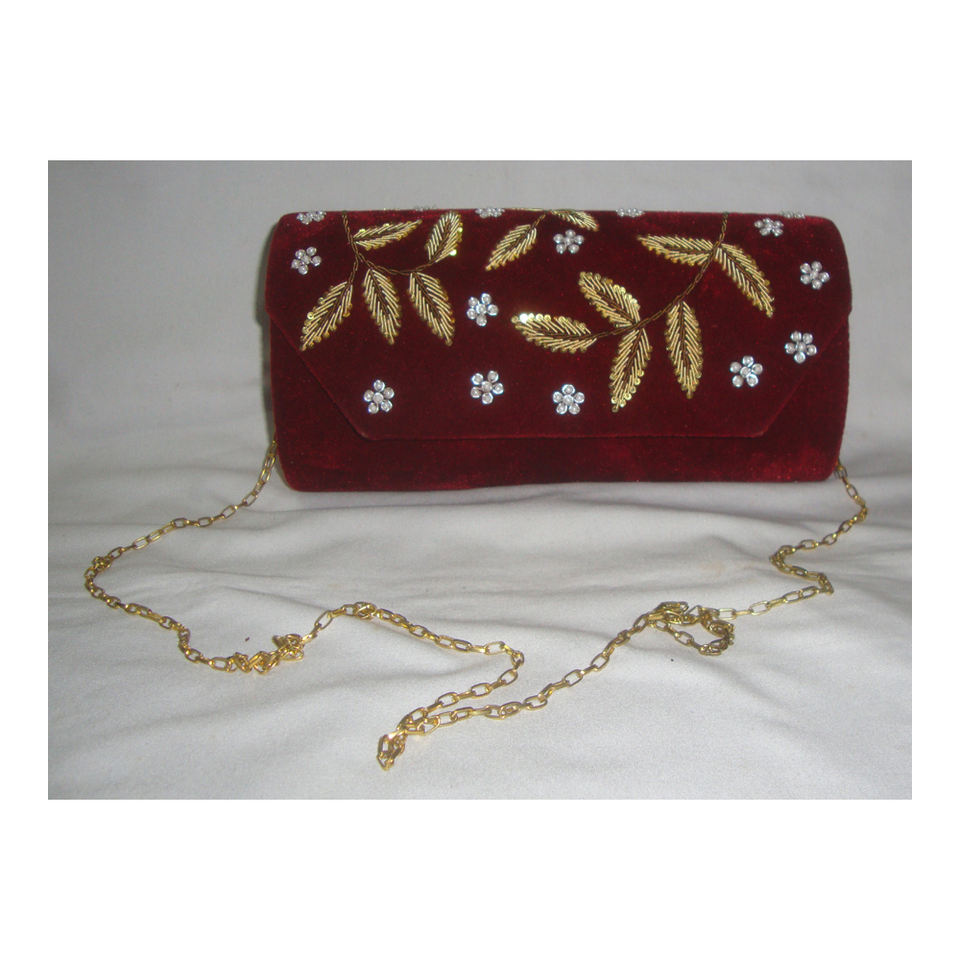 Shiny Maroom Colour Velvet Works Rectangular Hanging Ladies Clutch Bag Zari Embroidery & Beaded for Party Manufacture for Export