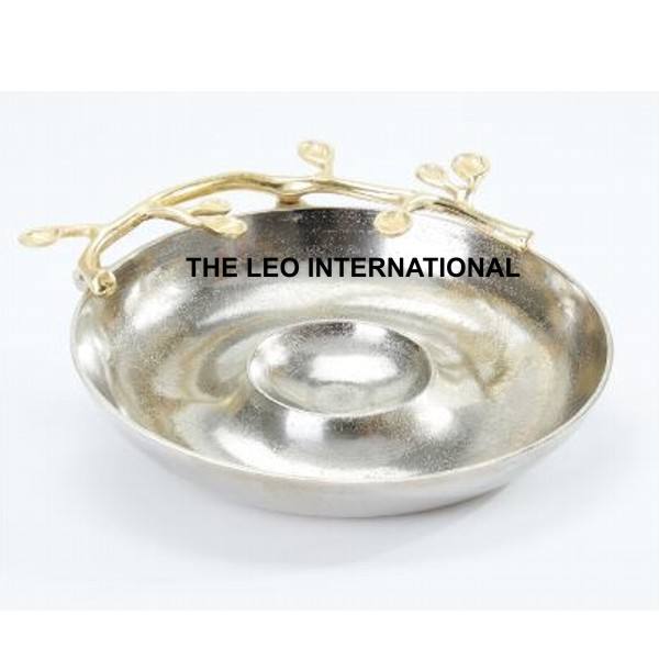 Shiny Polished Golden Plated Tree Branch Leaf Shape Design Round Decorative Bowl Stainless Steel Brass Metal Bowl