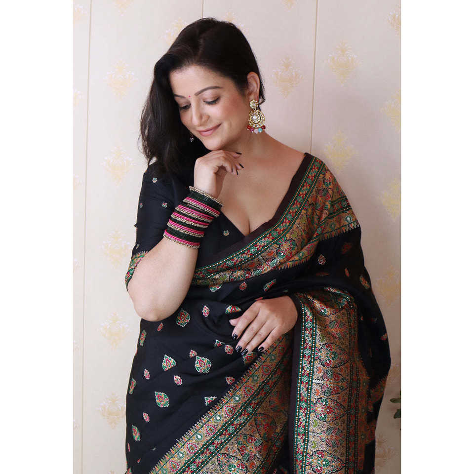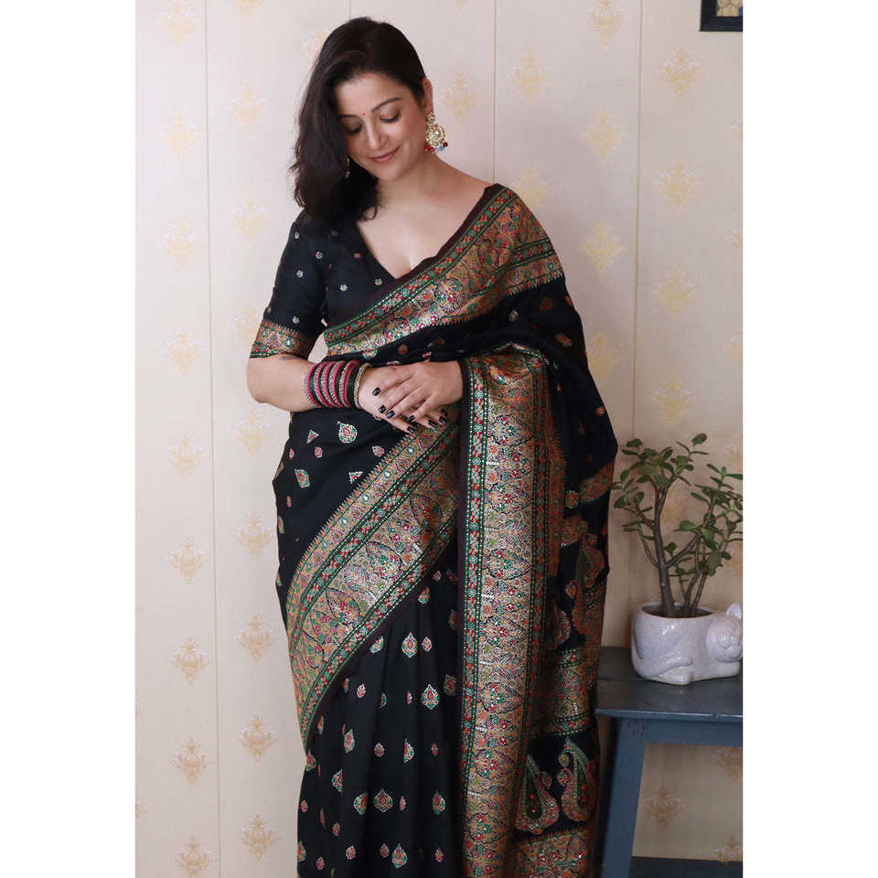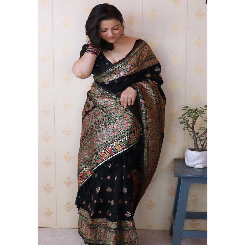 Shivani's Jade Black Pashmina Kashmiri Silk Saree with Zari Woven and Ethnic Scarves & Shawls