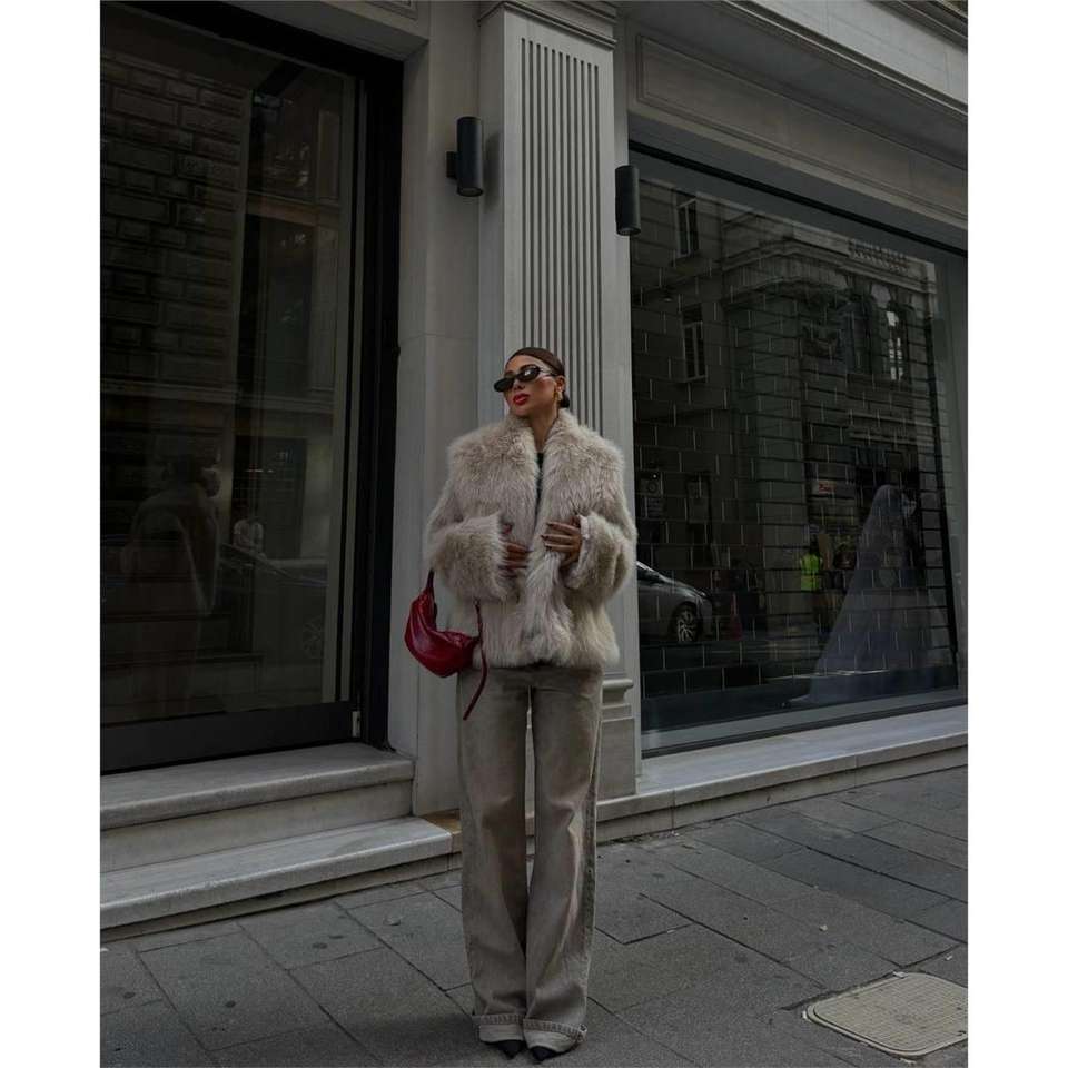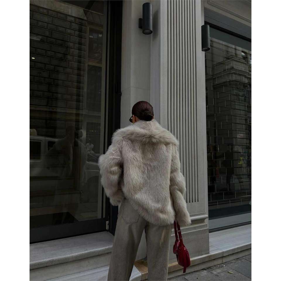 Short Faux Fur Coat in Stone Print Wool and Silk Zipper Closure Woven Processing Raw Material