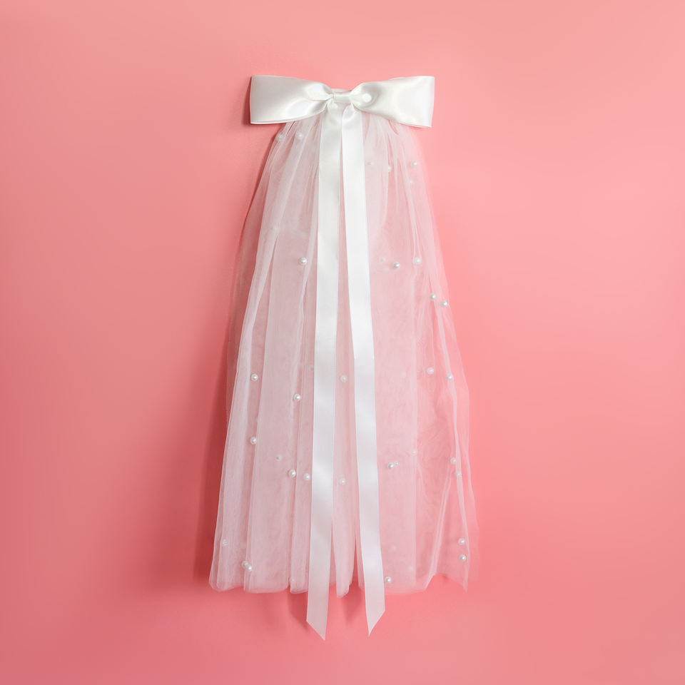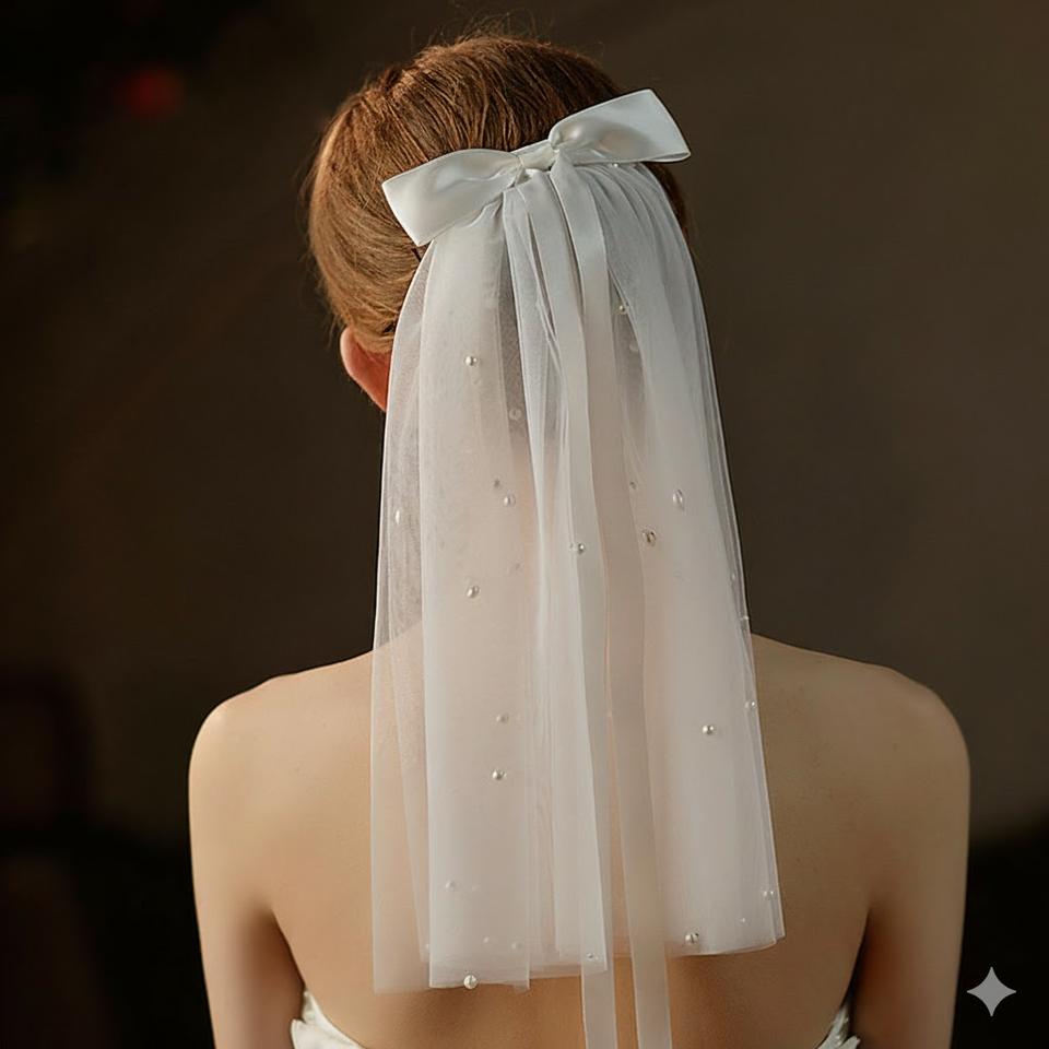 Short Pearl Wedding Veil with Bow Knot Two Tier Bachelorette Party White Bridal Veil Bride to Be Gift Flower Girl Veil
