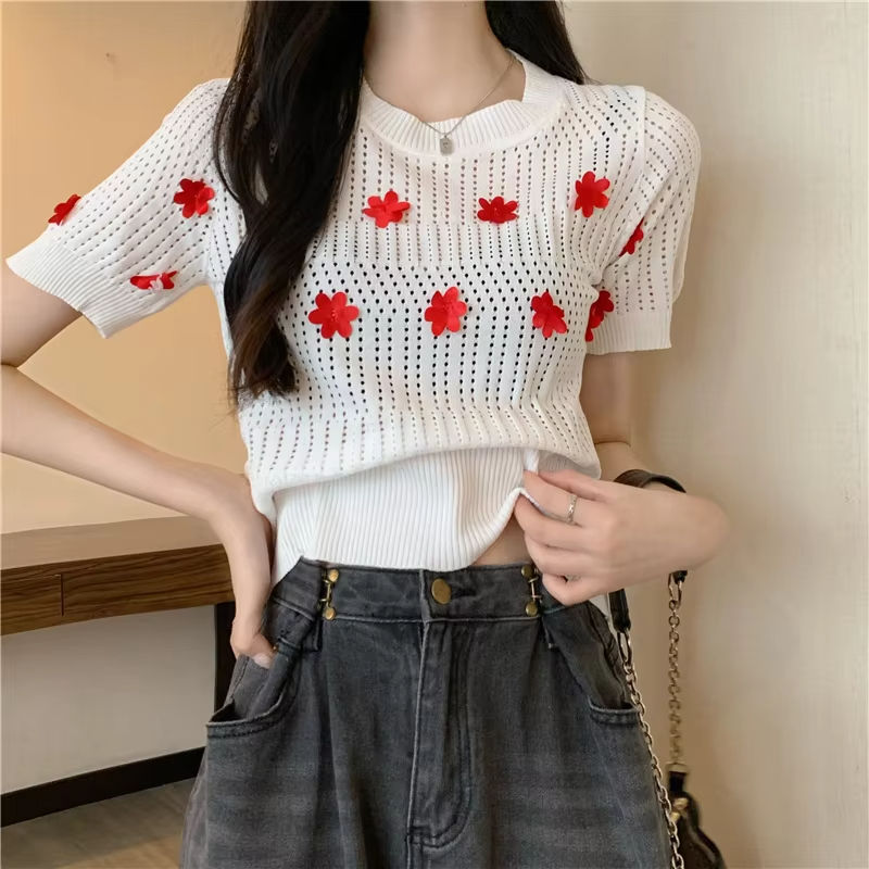Short-Sleeved Blouse Soft Tops for Women Cool Women's Clothing Ice Silk T-Shirt & Sweater Top Knitted with Real Shot Sensitivity