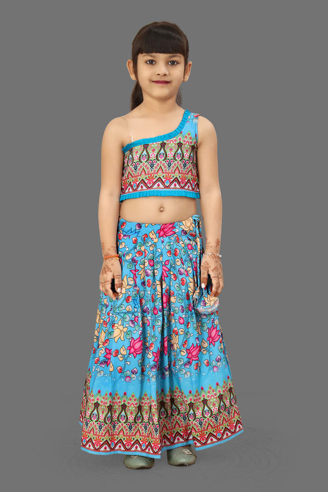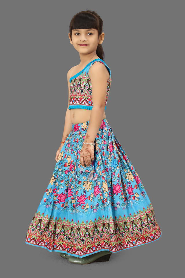 Shoryam Fashion Blue Floral Printed Kids Lehenga Choli Set for Girls One Shoulder Ethnic Wear Indian Traditional Party