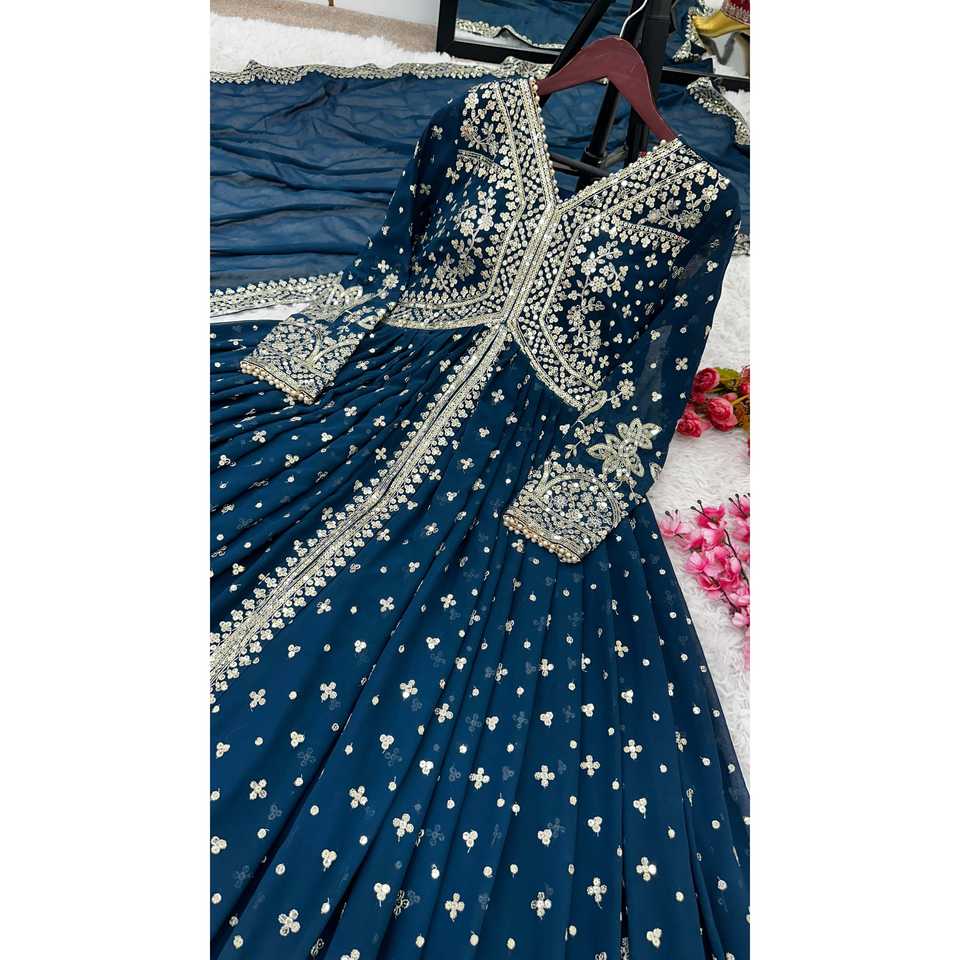 Shree Hari Fashion-SR Designer Indian & Pakistani Clothing Elegant Party Wear Gown with Lehenga and Dupatta Blue Size M