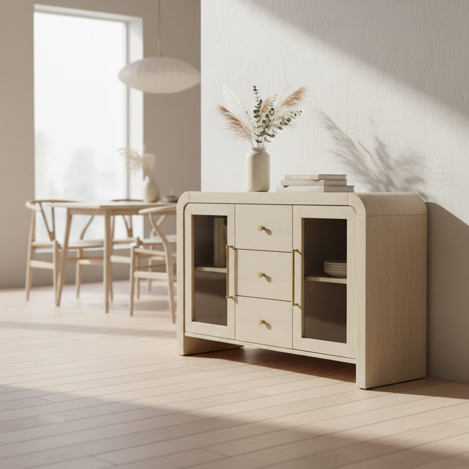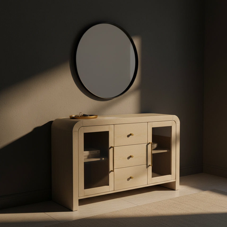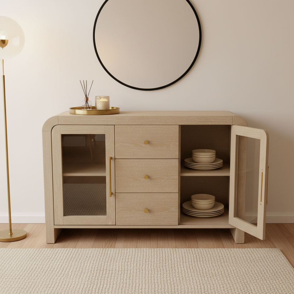 Sideboard Living Room Buffet Cabinet Console with three central drawers and two side glass-front, design modern color dynamic