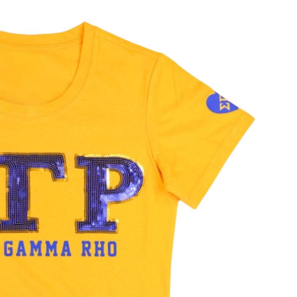 Sigma Gamma Rho SGRho Sequin Patch Tee Gold Greek Letters Embroidered Sorority Apparel Royal Blue Trim Greek Life T Shirt