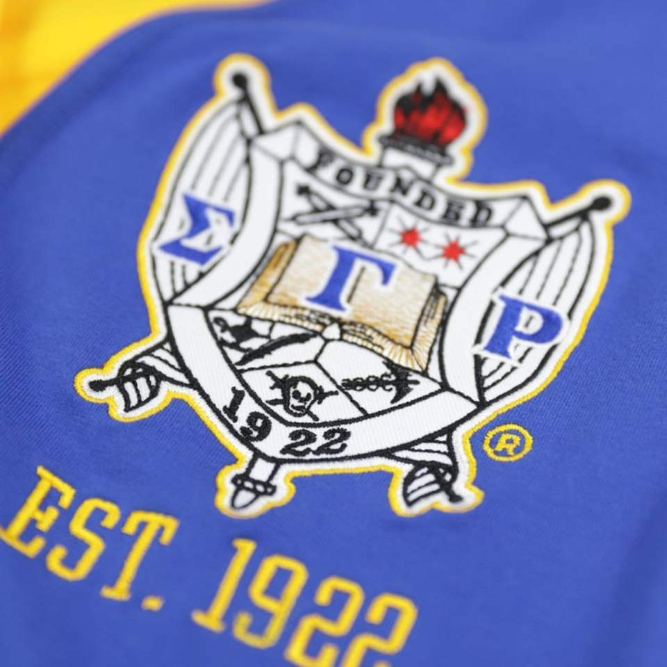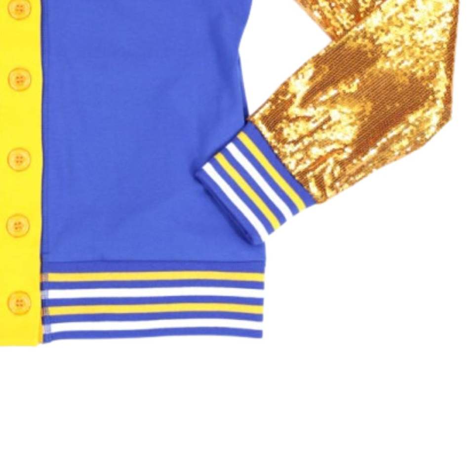 Sigma Gamma Rho SGRho Sequin Sleeve Cardigan Royal Blue Gold Greek Letters Embroidered Sorority Greek Life Apparel