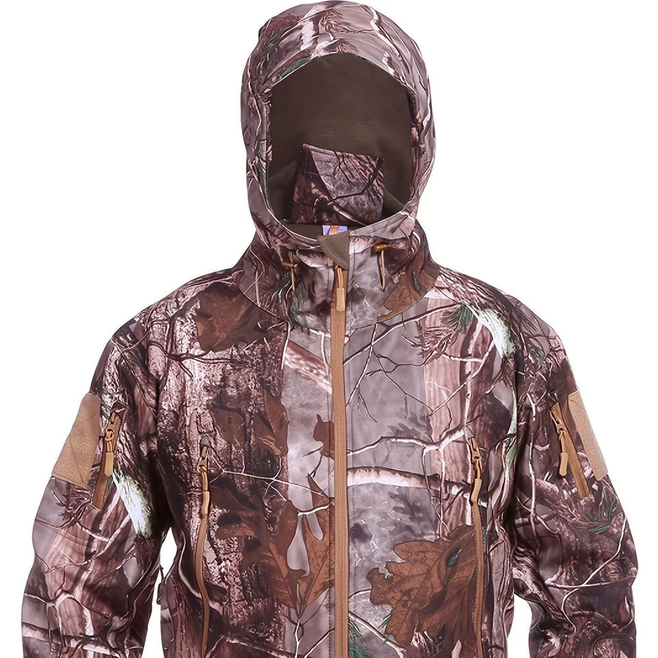 Silent Hunting Clothes for Men Soft Shell Outdoor hunting Jacket Camo Water Resistant Fleece Hooded Coat with Pockets