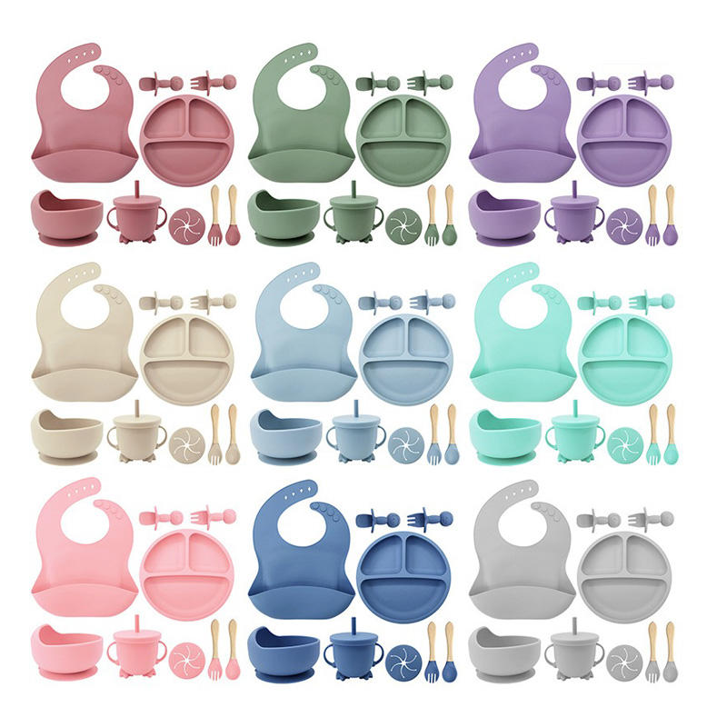 Silicone Baby Feeding Set | Food Grade BPA Free 9-Piece Eco-Friendly Dishwasher Safe Bowl Plate Bib Cup Utensils for Infants