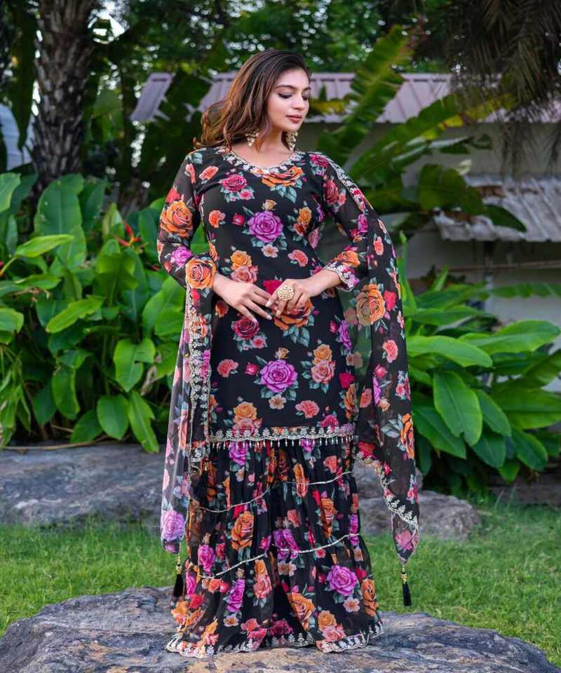 Silk Georgette Ready to Wear Top Sharara Dupatta Indian Party Wear