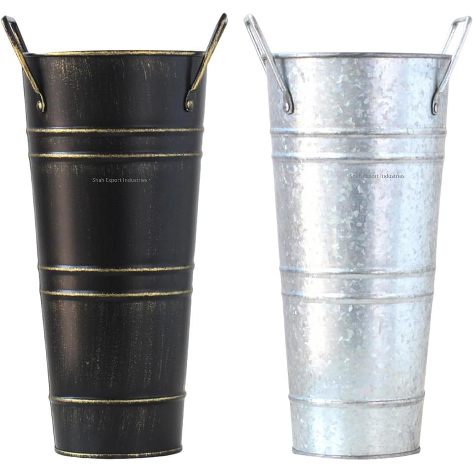 Silver & Black Galvanized Metal Flower Planters With Handles for Home Living Area Garden Decorative Tall Planters