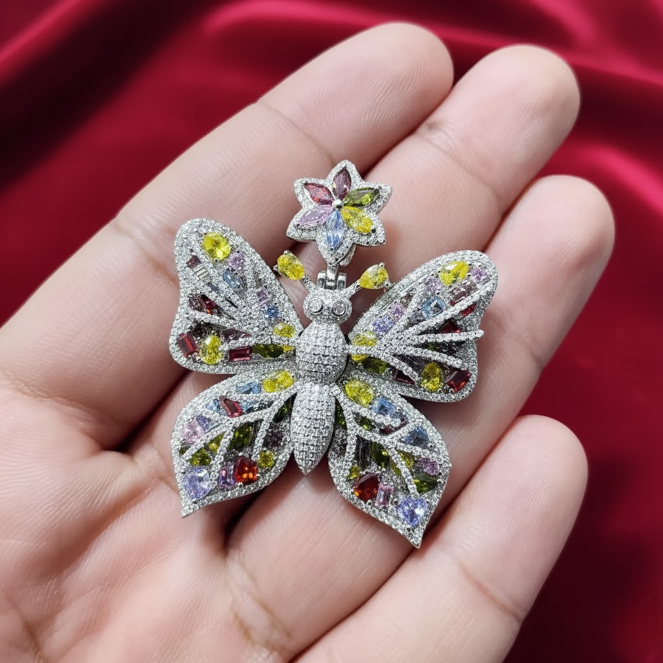 Silver Butterfly Pendant With Colorful Moissanite Diamond Floral Top Design Iced Luxury Statement Necklace For Women