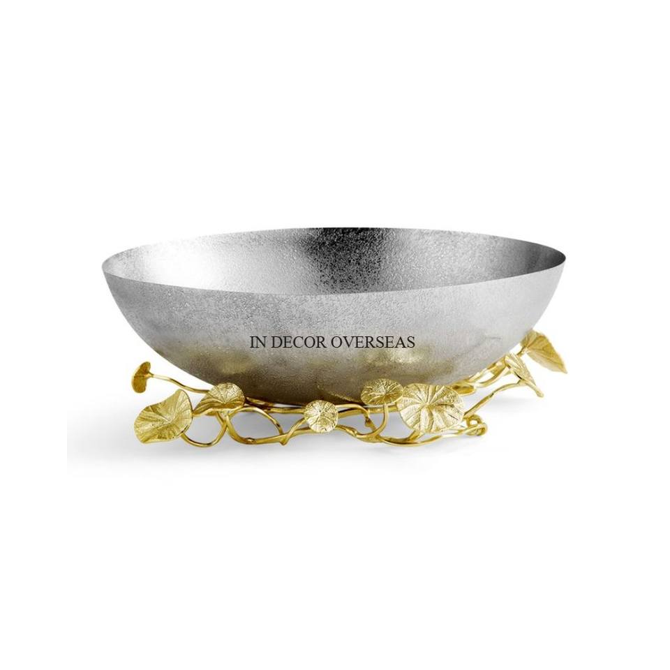Silver Color Shiny Polished Unique Texture Round Shape Premium Quality Metal Bowl With Gold Plated Lotus Leaves Designer Base