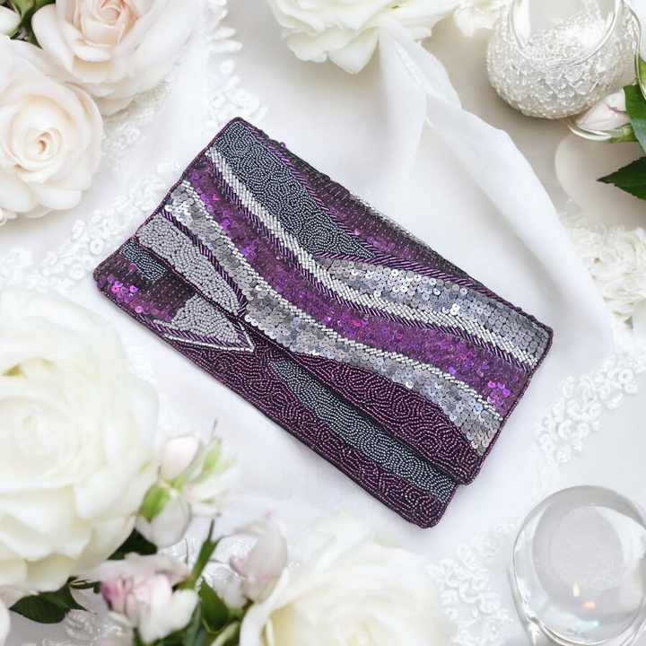 Handmade Elegant Boho Style Purple Sequin Beads Evening Purse Silver Embroidery Autumn Features Chains for Indian Women Travel