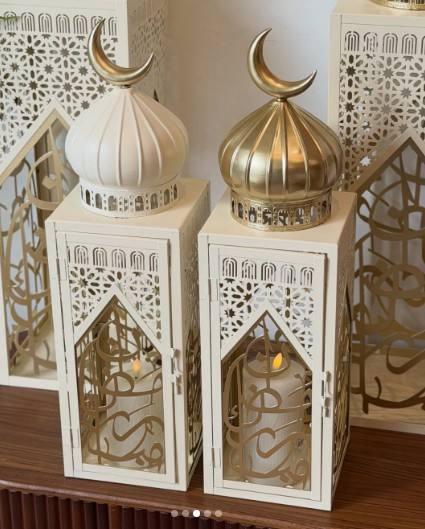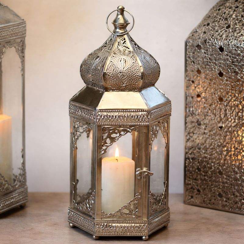 Silver Finish Metal Moroccan Lantern with Glass Panels Intricate Cutwork Warm Candle Glow Elegant Festive Home Decor Gift