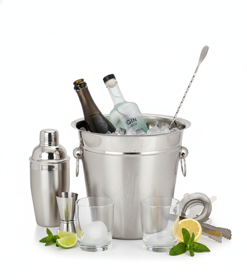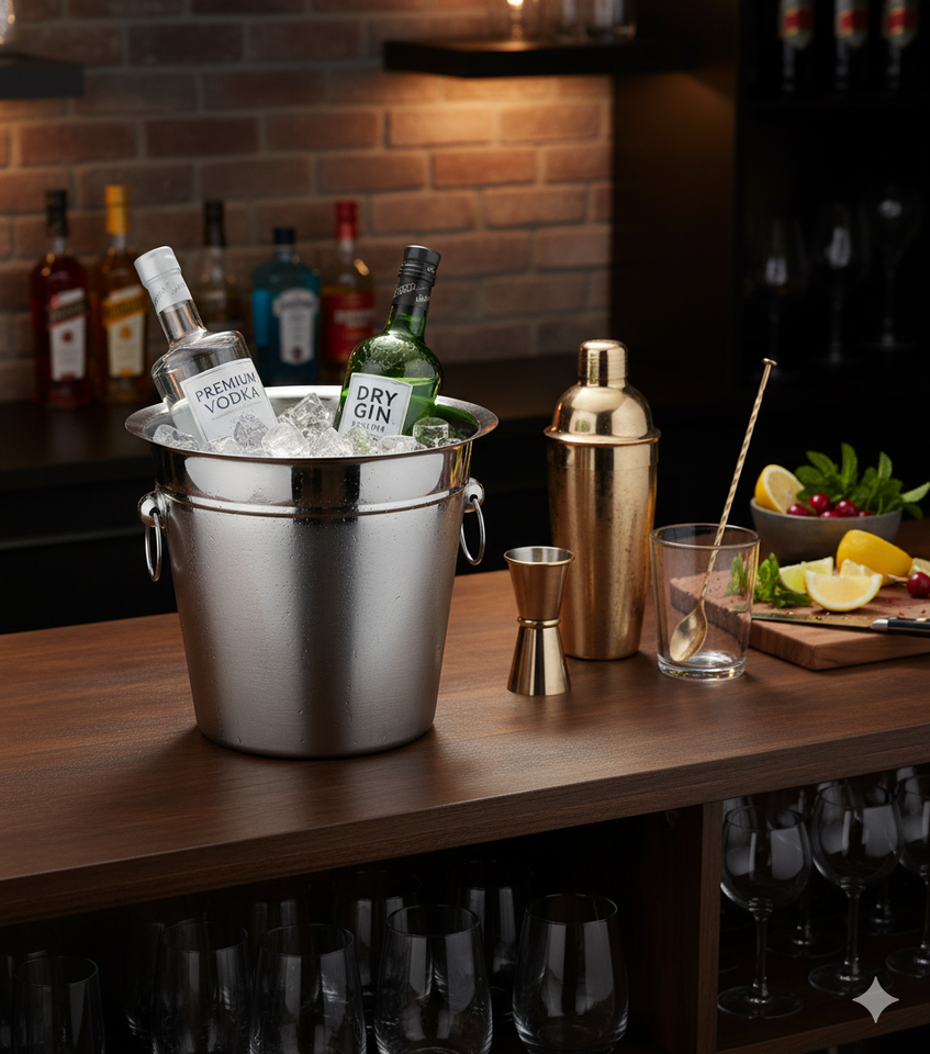 Silver Finish Stainless Steel Ice Bucket with Side Ring Handles for Cocktails Bar Accessories Metal Material