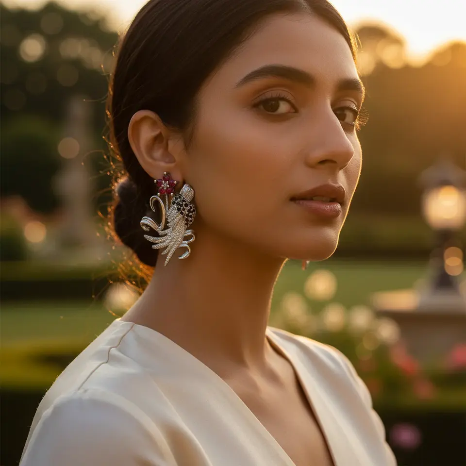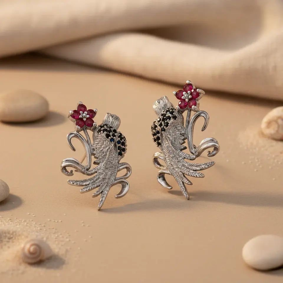 Silver Floral Bird Drop Earrings for Women Vintage Style Religious Christian Jewelry with Red Gemstones Coral for Party Gift