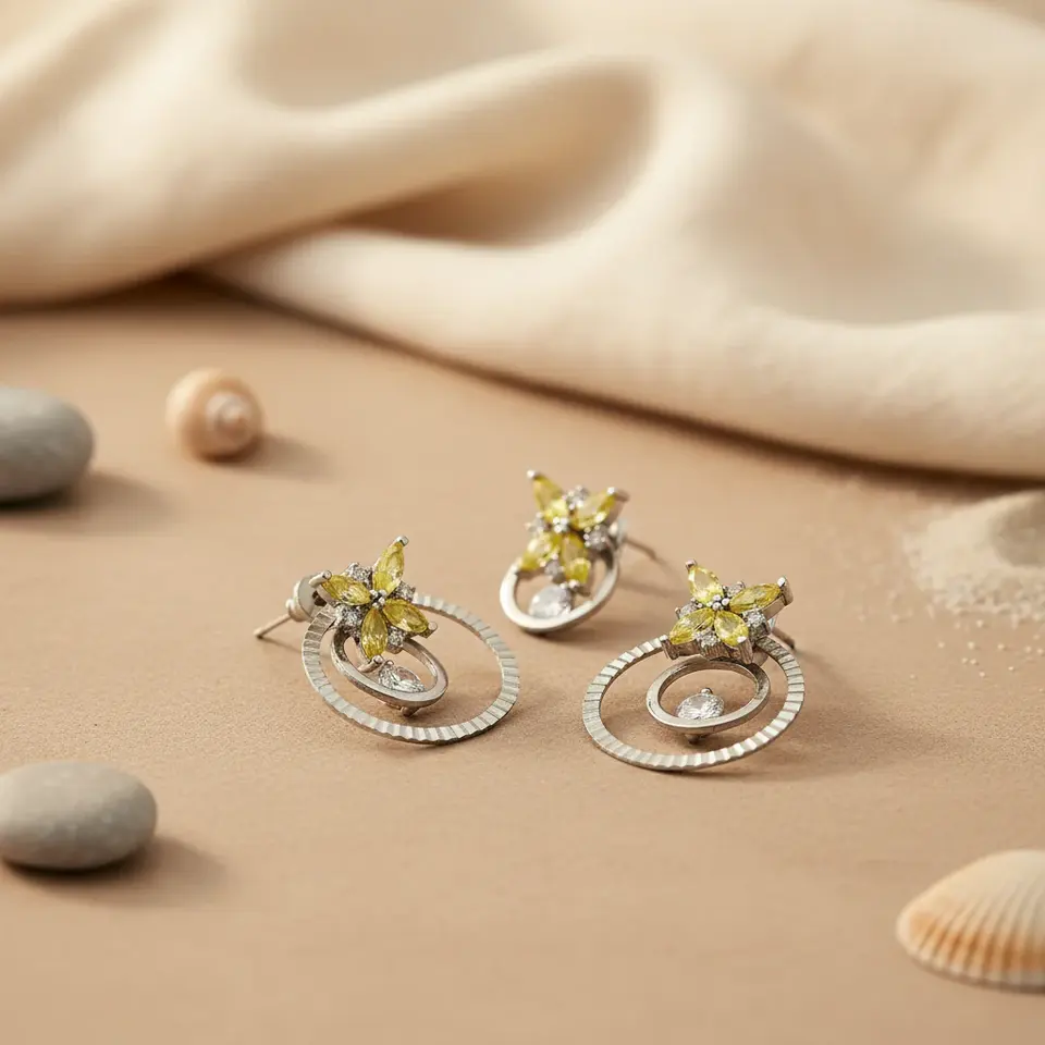 Silver Flower Fine Stud Earrings & Pendant Set with Yellow Gemstone Elegant Jewelry