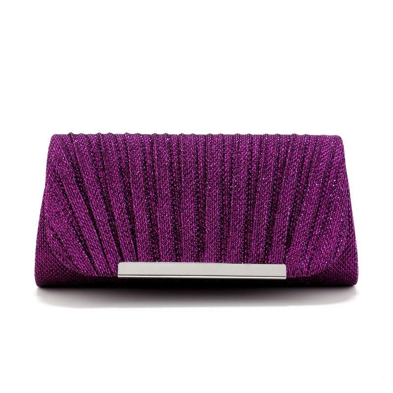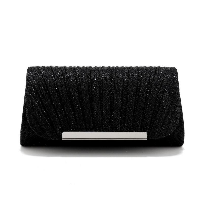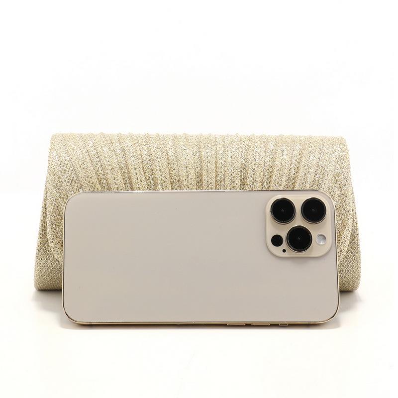 Silver Glitter Evening Clutch Bag Fan Pleated Design Metallic Bar Closure Formal Party Handbag with Detachable Chain Strap