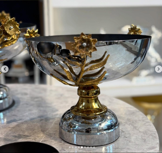 Silver Gold Metal Serving Trays And Tier Stands And Bowls Dishes With Floral Pattern Made of Stainless Steel And Brass Indian