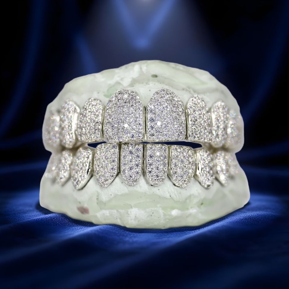 Silver Grillz With Upper And Lower Set Moissanite Accents Iced Out Luxury Hip Hop Dental Jewelry Sparkling Bold Statement Style