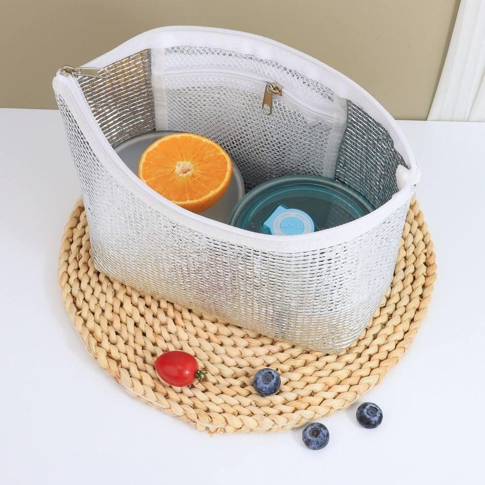 Silver Insulated Lunch Bag With Mesh Lining Aluminum Material Zipper Closure For Food Storage