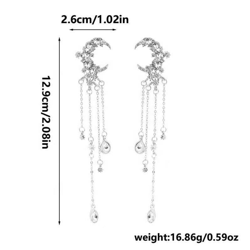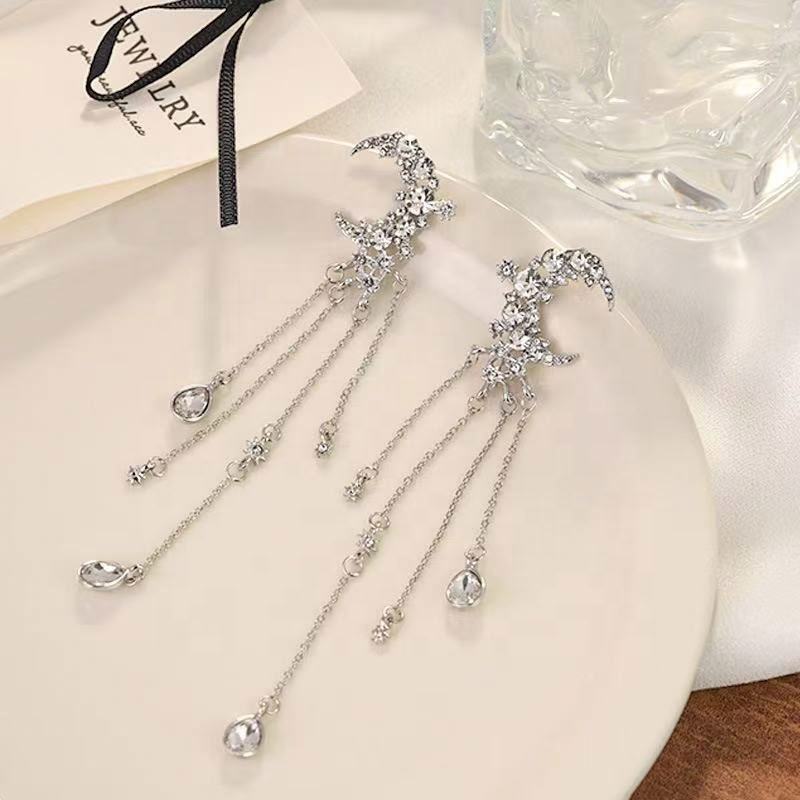 Silver Needle Studded Diamond Moon Long Tassel Earrings Trendy High-End Fashionable Hoop Earrings Versatile Exaggerated Niche