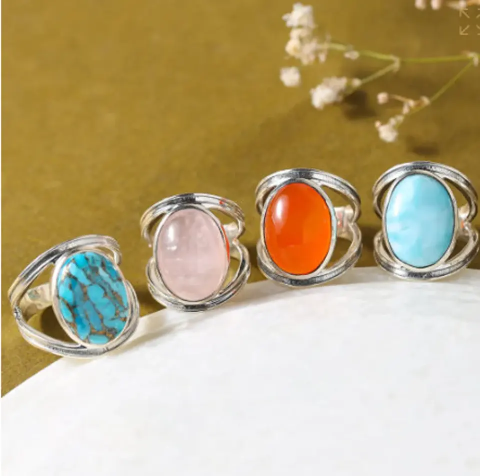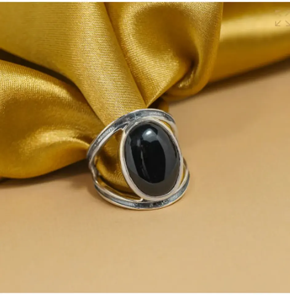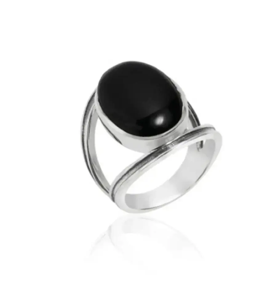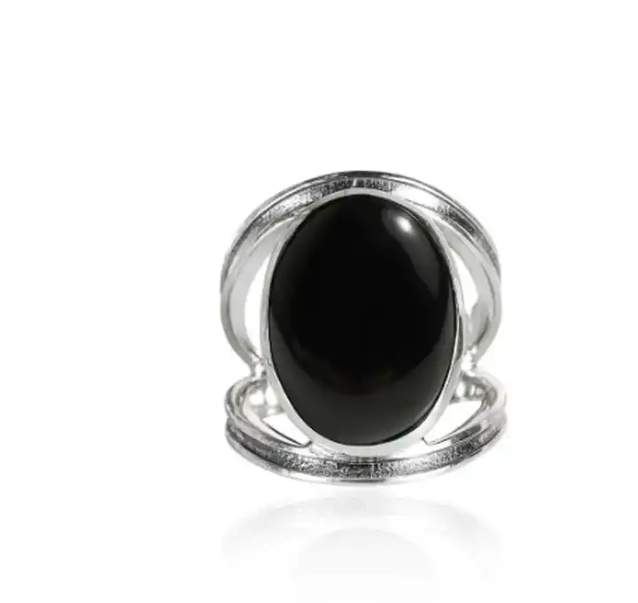 Silver Plated Brass Black Onyx Oval Ring Chunky Statement Open Band Modern Adjustable Fashion Jewelry Wholesale Women Girls
