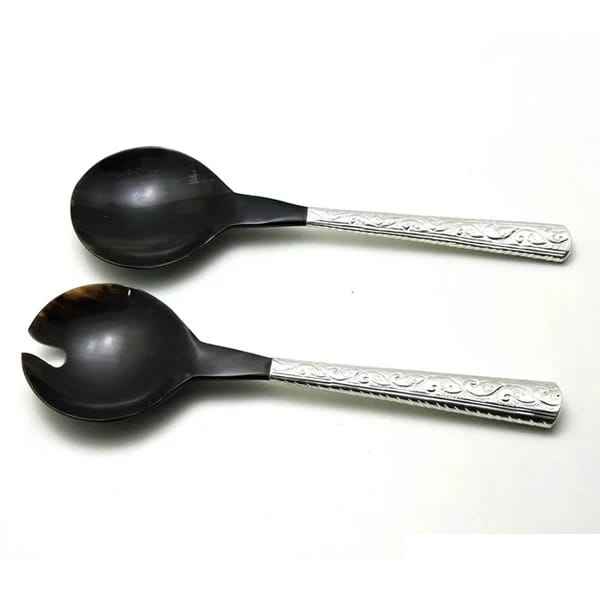 Silver Plated Metal Handle Natural Buffalo Horn Salad Tools Handcrafted Eco-Friendly Dishwasher Safe Kitchen Utensil for Hotels
