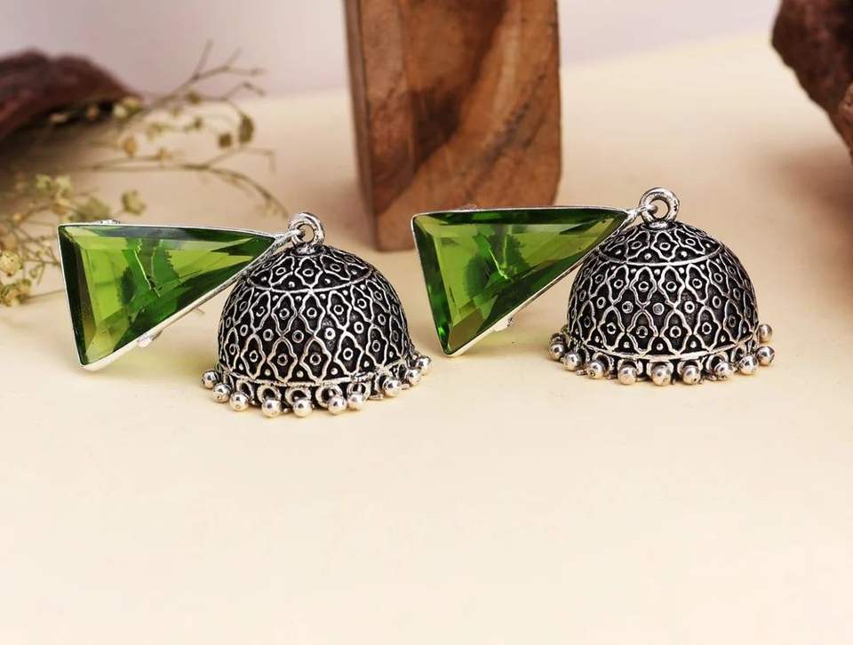 Silver Plated Oxidized Green Contemporary Jhumka Earrings With Huge Stone For Women Party Wear
