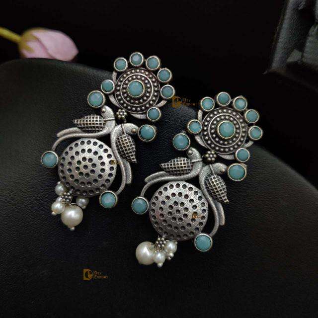 Silver Replica Oxidised Peacock Dangler Earrings With Pearl Beads Gift for Casual Party Wear Handmade Bulk Product