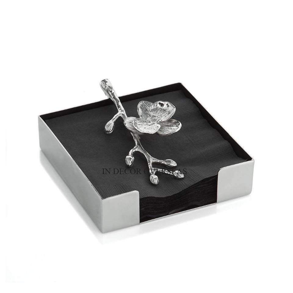 Silver Shiny Polished Flowers And Buds Designer High Standard Quality Metal Napkin Holder With White Marble Base From India