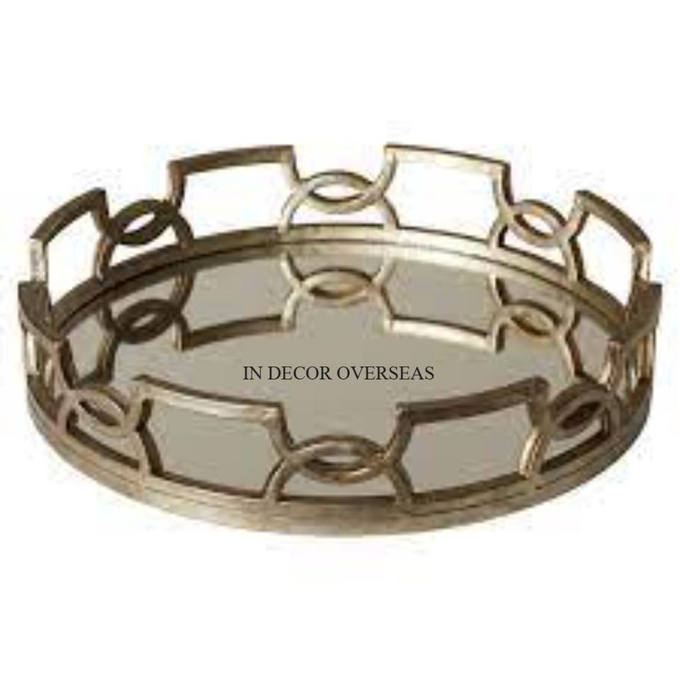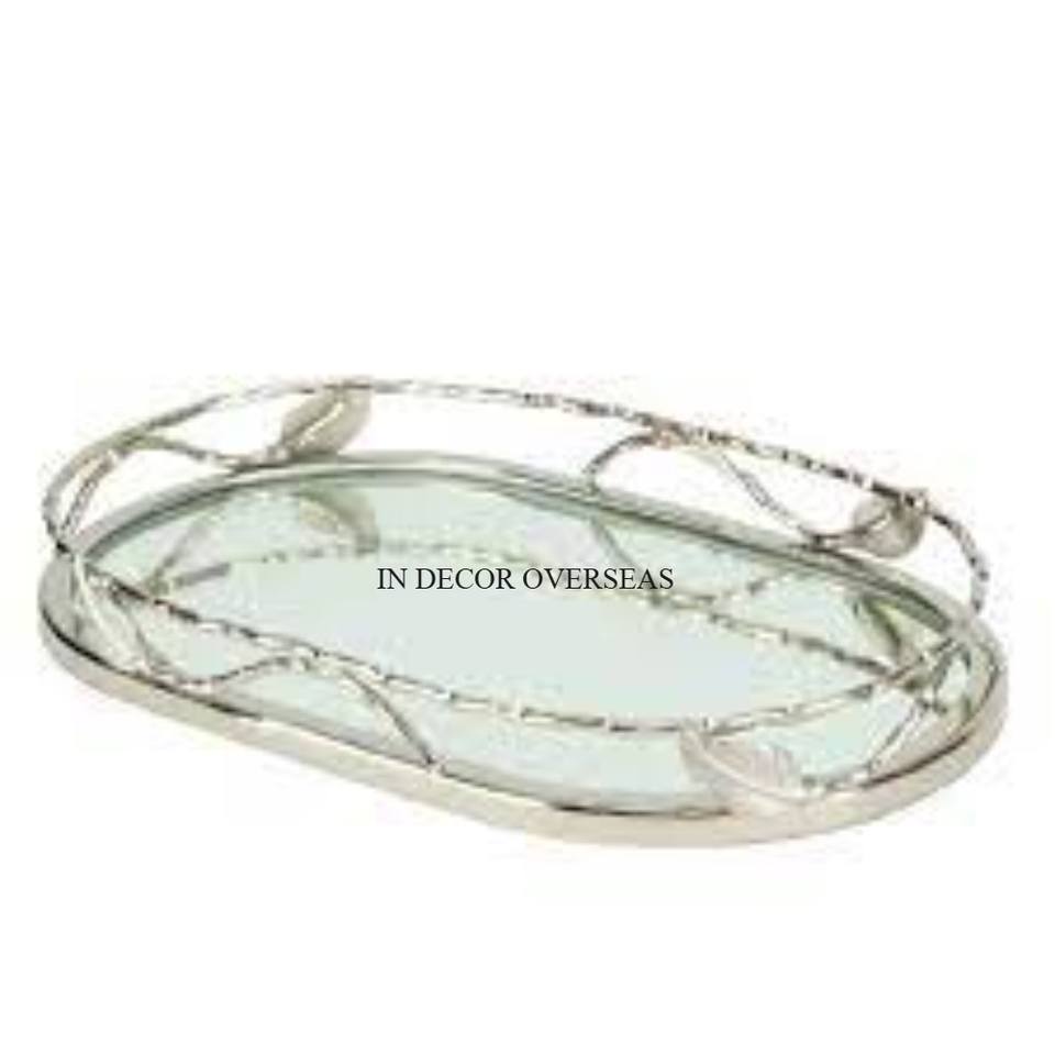 Silver Shiny Polished Leaves Designer Heavy Duty Metal Framed Oval Shape Mirror Tray Restaurant And Hotel Table Centerpiece