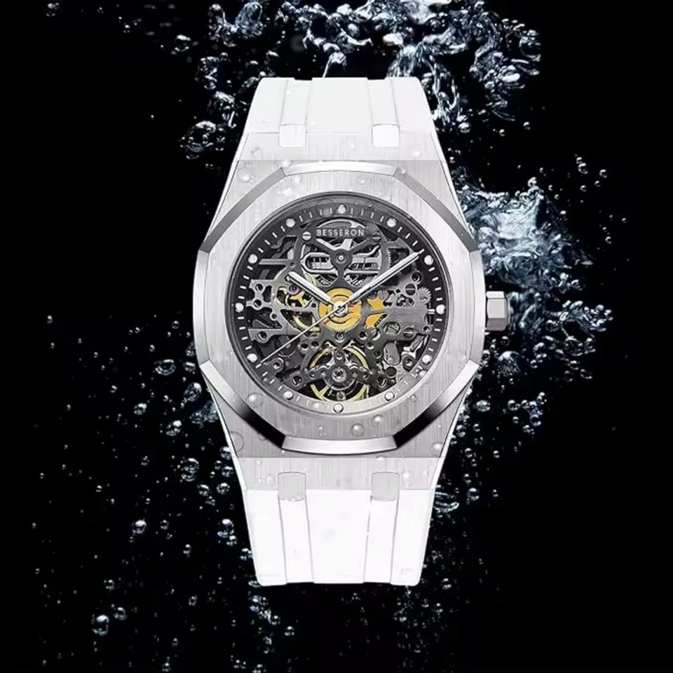 Silver Skeleton Watches for Men 42mm Waterproof Watches for Men Automatic Watch