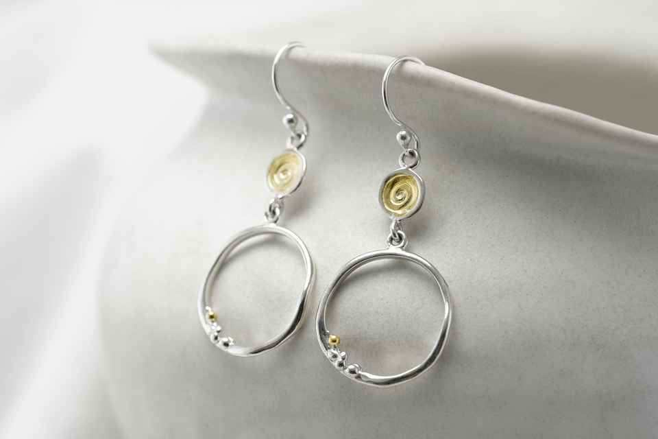 Silver Spiral Earrings, Organic Hoop Drop Earrings with Gold Spiral Detail, Mixed Metal Earrings, 925 Sterling Silver Earrings