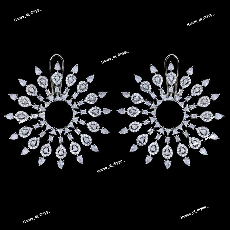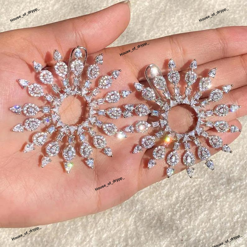 Silver Sunburst Moissanite Earrings Big Bold Fashion Statement Jewelry Elegant Round Cut Sparkling Earrings For Women