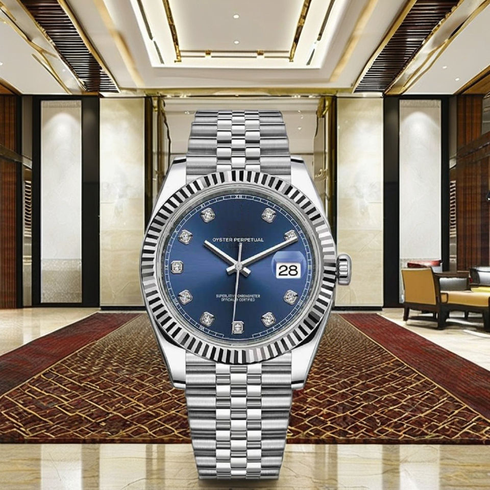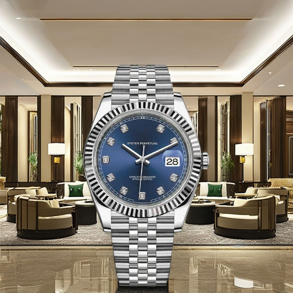 Silver Tone Luxury Sport Stainless Steel Watch High Quality Blue Sunray Dial with Diamond Hour Markers Business Simple Fashion