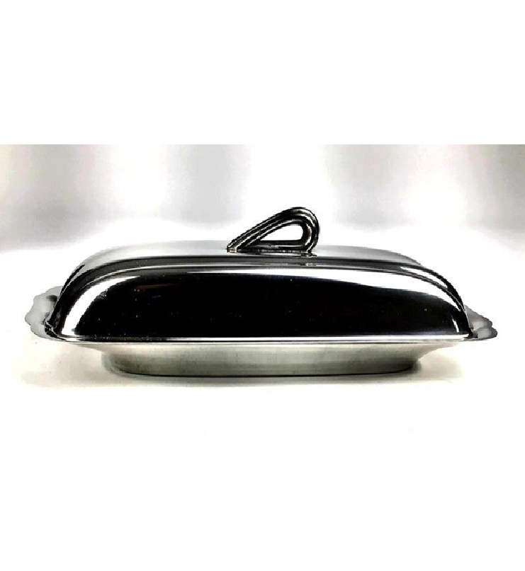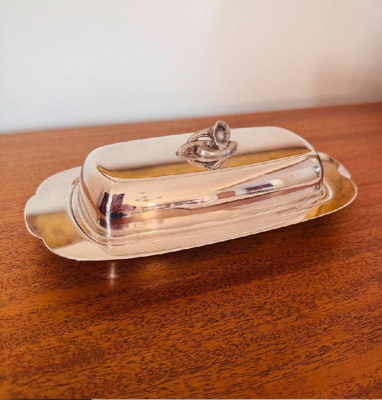 Silver butter dish, polished metal, decorative flower handle, elegant, classic, modern serveware.