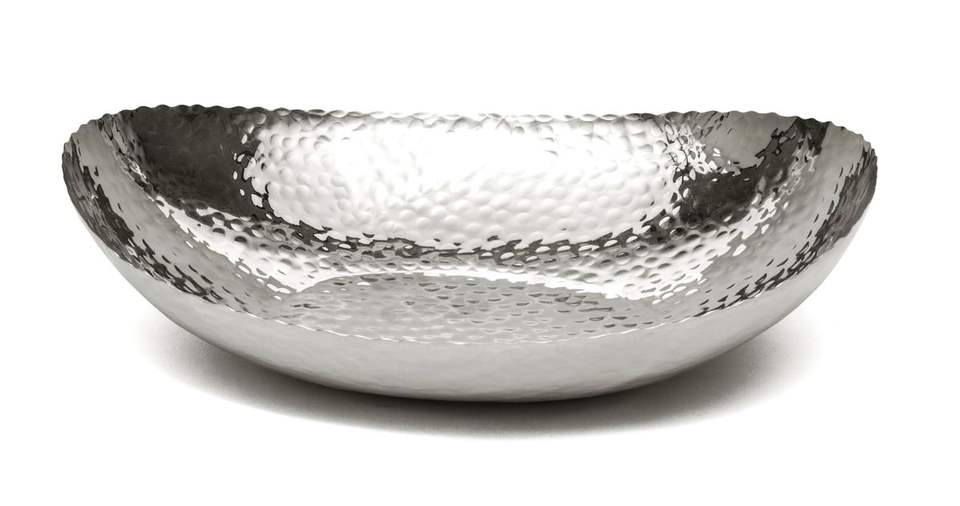 Silver polished metal chocolate bowl with scalloped edges ideal for home dining decor and formal serving presentation