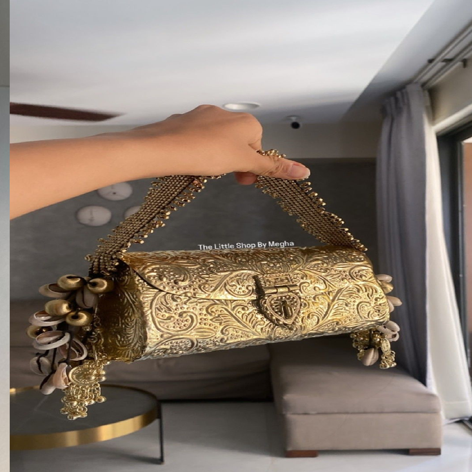 Silver-toned metal purse with a delicate all-over floral and leaf pattern and sturdy twin handles. Available at wholesale price.
