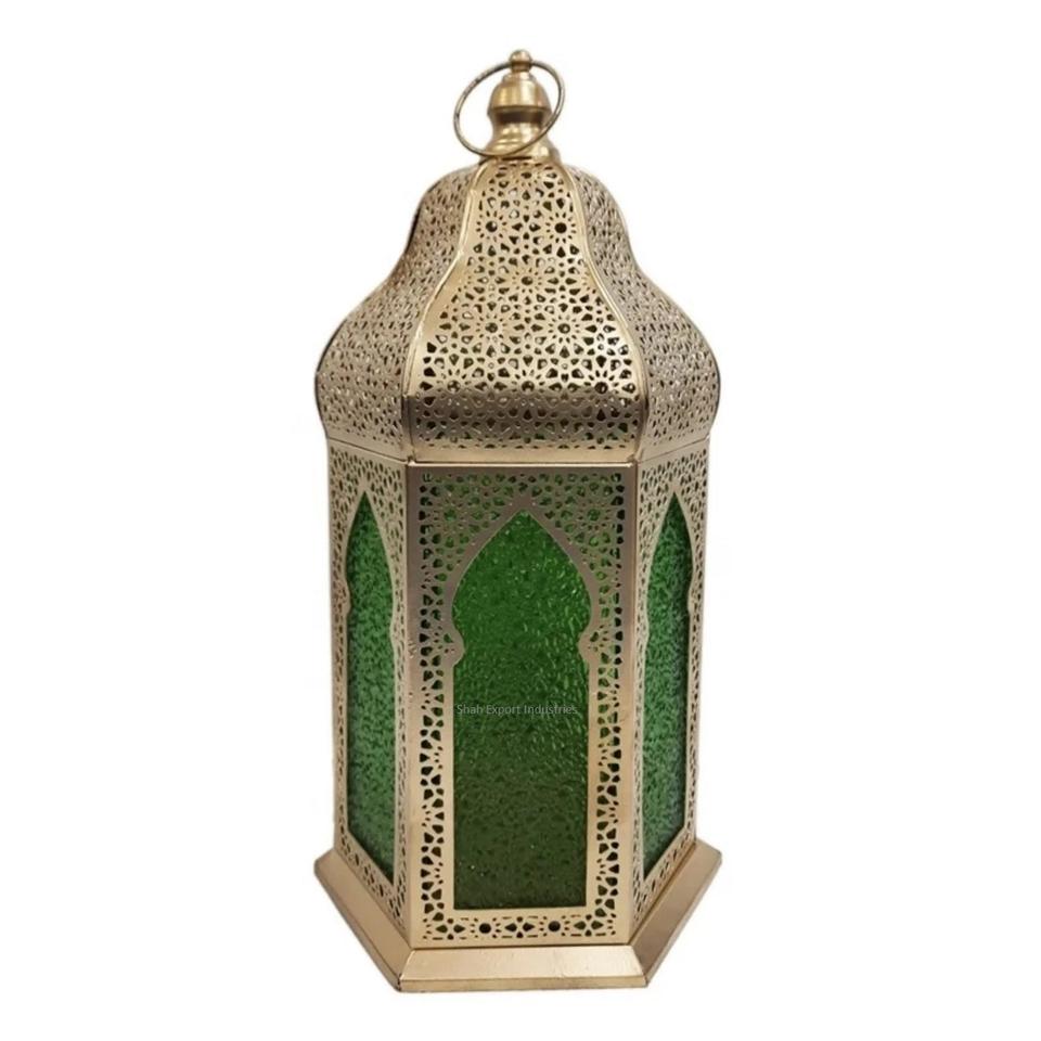 Simple Creative Metal Gold Moroccan Candle Lantern with Green Color Glass Home and Wedding Decor Floor Lanterns