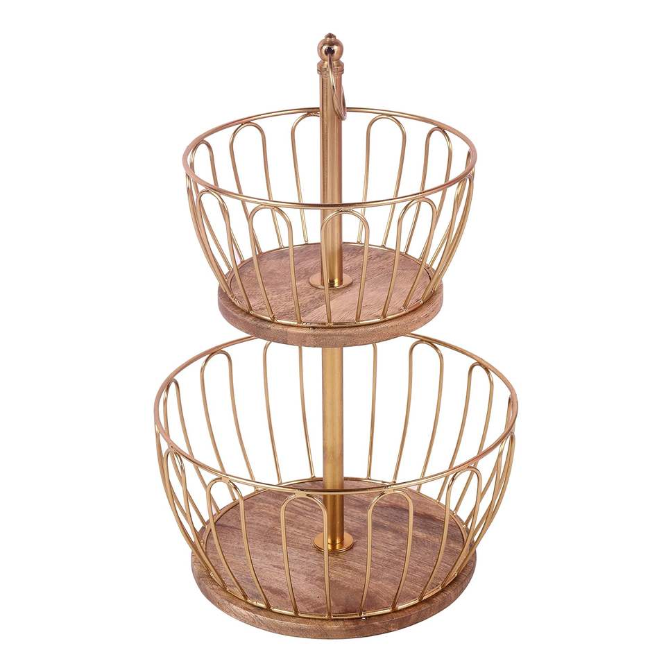 Simple Living Home Decor Gold Fruit Basket Stand Wooden Base Fruit Basket Metal Wire Fruit Basket Countertop Storage Basket