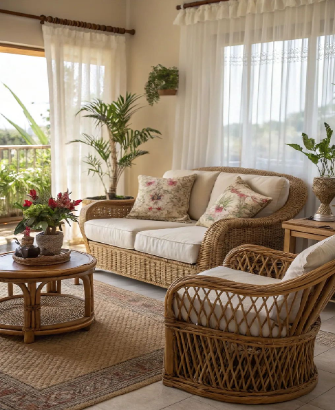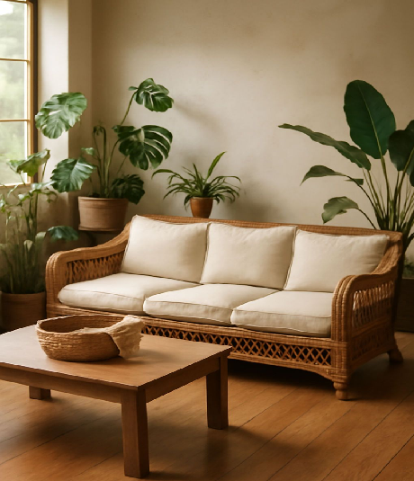 Simple rattan sofa with cream cushions and a wood table. Available at wholesale prices