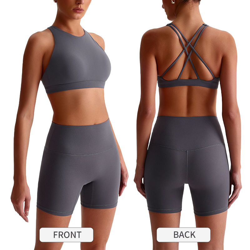 Simple shorts and n Cross Back Crew Neck Padded Bra and High Waist Hip Lifting Yoga Shorts Set