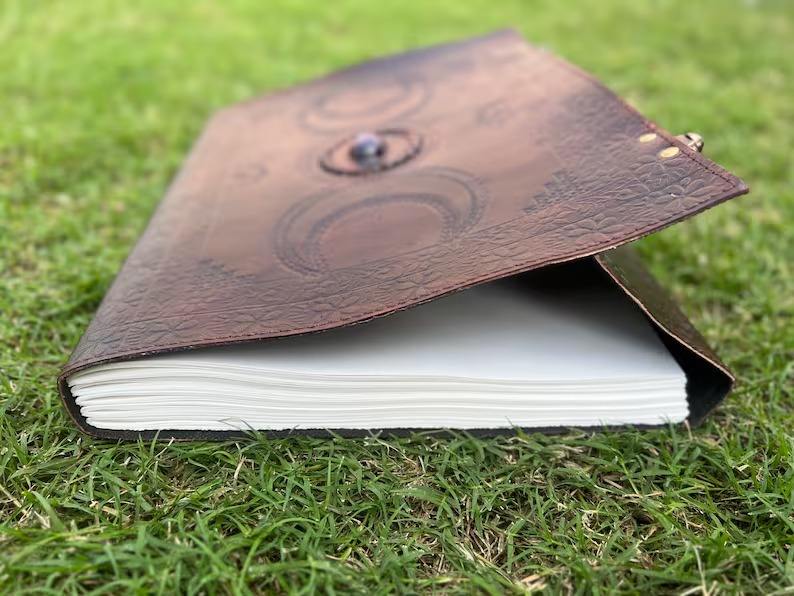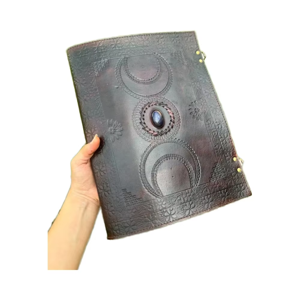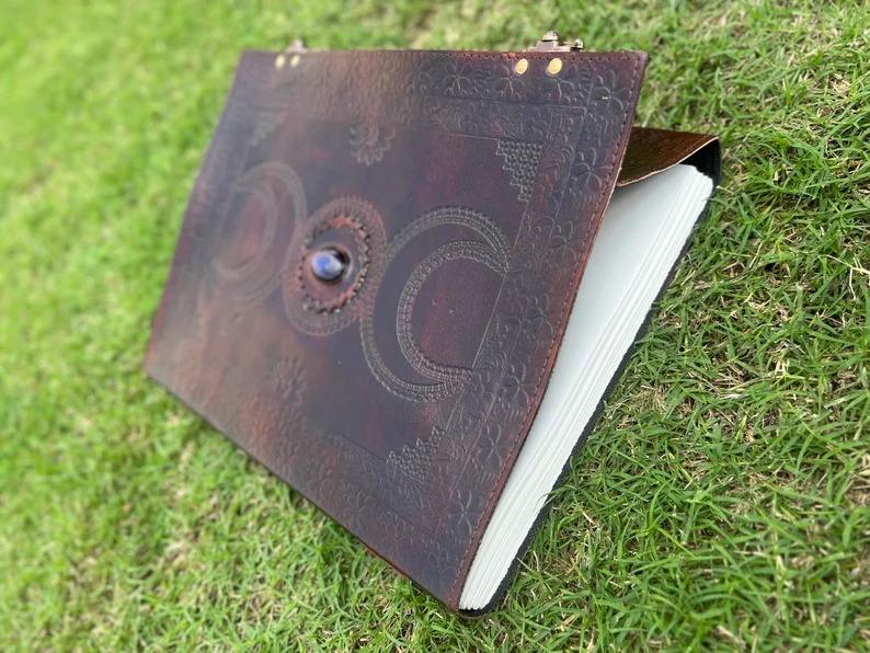 Single Black Stone Leather Large Bound Book with Gemstone, Hand Made Sketch Single Stone Journal Notebook Leather Diary