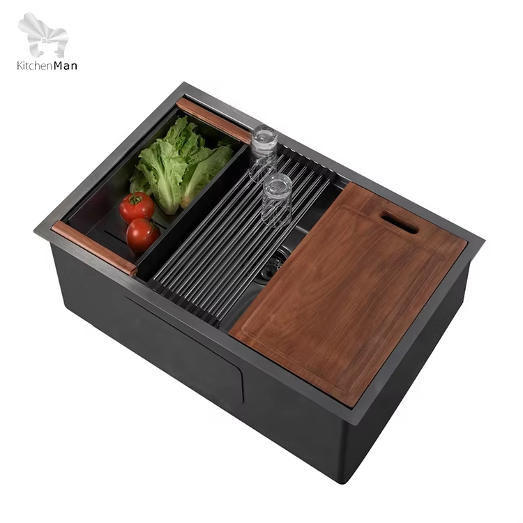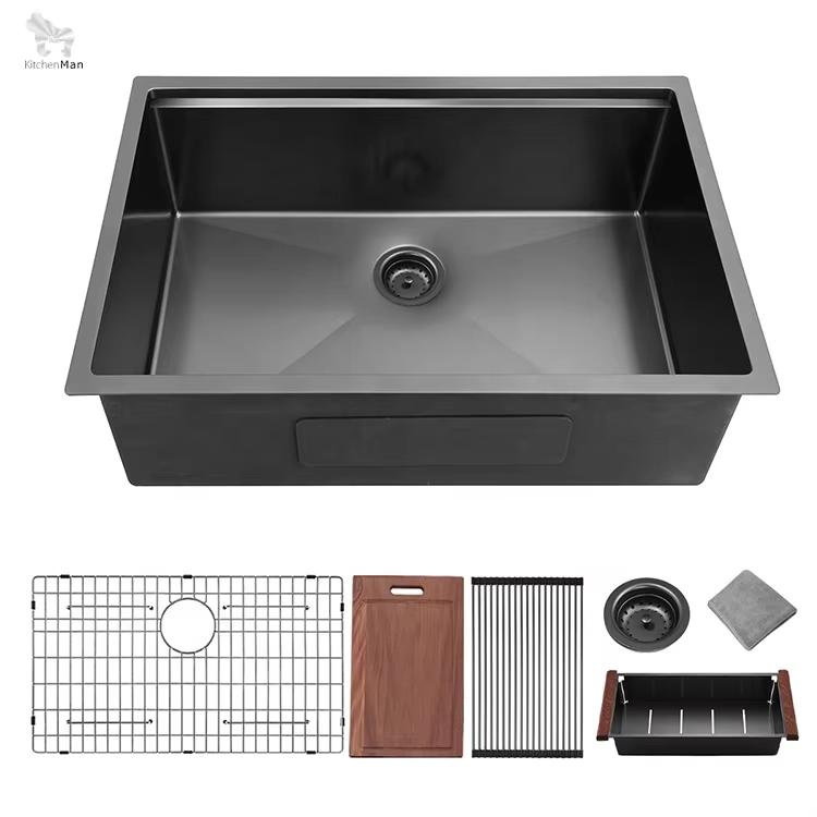 Single Bowl 304 Stainless Steel Kitchen Sink Black Undermount Counter Installation with Strainer Accessory & One-Hole Feature