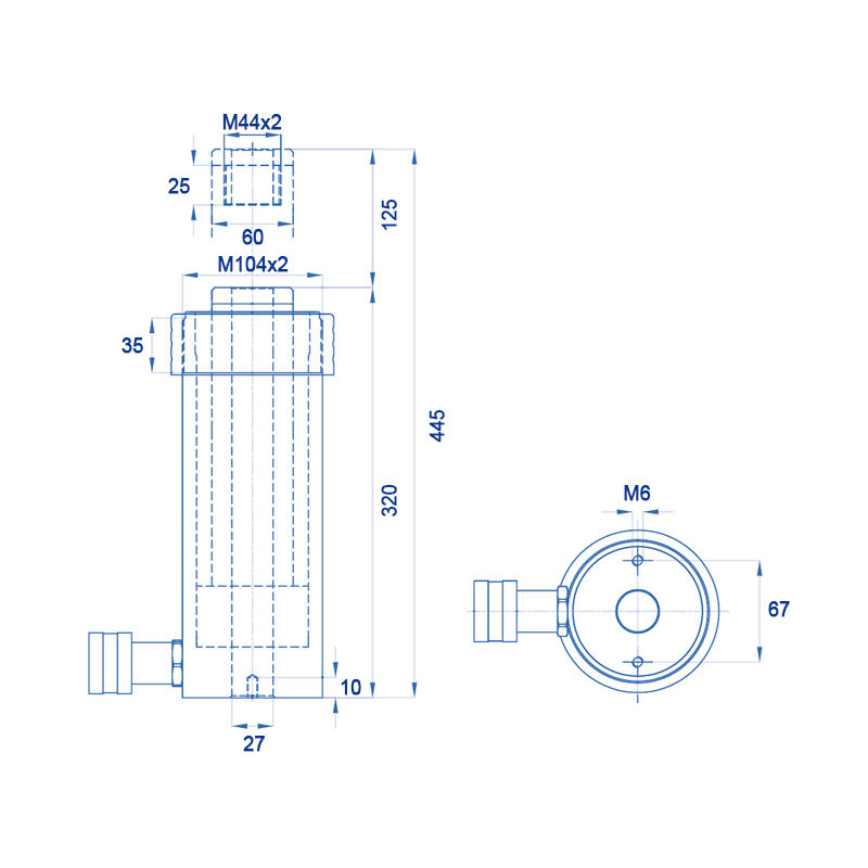 Single-acting hydraulic cylinder with hollow piston OMCN 367, spring return, h.445mm, 24 tons